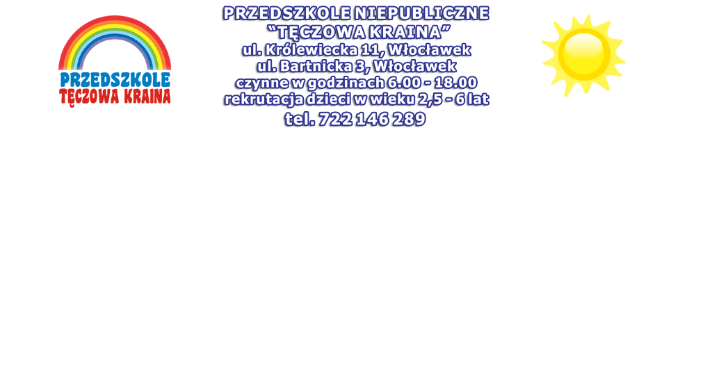 Zajęcia dydaktyczne "Dzień tęczy" - rozwijanie kreatywności plastycznej Cykl zajęć kulinarnych: "Zdrowo i kolorowo" - CZEKOLADKI, CIASTECZKA, BABECZKI i GOFRY Z OWOCAMI w wykonaniu naszych przedszkolaków :) "Nadchodzi Wielkanoc - co to jest tradycja?" - zapoznanie ze zwyczajami i symbolami wielkanocnymi "Wiosenne inspiracje" - zabawy w parku oraz ogródku przedszkolnym, obserwowanie budzącej się przyrody, poznawanie oznak wiosny Zajęcia edukacyjne z AKADEMIĄ EGZOTYCZNEJ PRZYRODY - poznajemy niesamowite ciekawostki ze świata egzotycznych zwierząt DZIEŃ KOBIET Wycieczka do KINA na seans filmowy pt.: "Orzełek Iggy" Zajęcia dydaktyczne "Ptasia stołówka" WALENTYNKI TŁUSTY CZWARTEK - poznajemy tradycyjne święto kończące karnawał BAL KARNAWAŁOWY Wycieczka do BIBLIOTEKI [GRUPA ZIELONA] DZIEŃ BABCI i DZIADKA - uroczysty występ przedszkolaków: wspólne świętowanie, wiersze, piosenki i tańce :) "Wesołych Świąt" - magiczny, pełen ciepła, radości i wzruszeń ŚWIĄTECZNY SPEKTAL w wykonaniu GRUPY ZIELONEJ zrealizowany w Teatrze Impresaryjnym we Włocławku "Wesołych Świąt" - magiczne, pełne ciepła, radości i wzruszeń PRZEDSTAWIENIA ŚWIĄTECZNE GRUPY CZERWONEJ oraz GRUPY ŻÓŁTEJ Uroczysta WIGILIA PRZEDSZKOLAKÓW - poznawanie tradycji Bożego Narodzenia, "Nauka życzliwości" :) „SPOTKANIE Z MIKOŁAJEM” - pielęgnowanie zwyczajów mikołajkowych, wprowadzenie dzieci w świąteczny nastrój świąteczny "Choinka przedszkolaków" - kształtowanie tradycji świątecznych ANDRZEJKI - poznajemy dawny zwyczaj wróżb oraz tradycje, zabawy i obrzędy ludowe "Powitanie zimy": zabawy na śniegu - doskonały sposób na propagowanie spędzania czasu na świeżym powietrzu Cykl zajęć "Nie mam telefonu, mam ciekawe życie" - promowanie odkrywania świata i wartościowanego spędzania czasu zamiast spędzania czasu przed ekranami DNIA KUNDELKA - organizacja zbiórki karmy i innych artykułów dla zwierząt znajdujących się w schronisku we Włocławku DZIEŃ POCZTY POLSKIEJ - poznawanie roli poczty w życiu codziennym Uroczystości pasowania na PRZEDSZKOLAKA, ŚREDNIAKA i STARSZAKA Wycieczka do NADLEŚNICTWA we Włocławku - zajęcia przyrodnicze "Zapach lasu" oraz ognisko integracyjne przedszkolaków [GRUPA ZIELONA] DZIEŃ EDUKACJI NARODOWEJ "Nadeszła jesień" - zajęcia dydaktyczne poszerzające wiedzę przyrodniczą, zabawy lesie "Razem świętujemy DZIEŃ CHŁOPCA" - wzmacnianie więzi w grupie, a także budowanie atmosfery życzliwości i radości poprzez wspólną zabawę DZIEŃ PRZEDSZLKOLAKA - wycieczka do Centrum Zabaw "Rio" - zabawy integracyjne, budowanie dobrych relacji i poczucia bezpieczeństwa w grupie, rozwijanie umiejętności komunikacyjnych oraz współpracy Cykl zajęć wakacyjnych: Część III "Żegnamy lato zdrowo i na sportowo" - zwiększamy świadomość na temat roli i wagi aktywności fizycznej, odpowiedniego odżywiania i odpoczynku. Cykl zajęć wakacyjnych: Część II "Bezpieczne wakacje" - przypomnienie zasad bezpieczeństwa podczas zabawy nad wodą, w górach, w mieście i w domu Cykl zajęć wakacyjnych: Część I "Kolory lata" - wycieczki oraz zajęcia i zabawy utrwalające określanie charakterystycznych cech pór roku Uroczystości ZAKOŃCZENIA ROKU PRZEDSZKOLNEGO - przedstawienie pt. "Wakacji czas" DZIEŃ DZIECKA cz. 2 - Wycieczka do Zielonej Szkoły w Goreniu Dużym DZIEŃ DZIECKA cz. 1 - wycieczka do Teatru Impresaryjnego na spektakl pt. "Błękitek - mówiący wieloryb" oraz wspólne zabawy, gry i niespodzianki w ogródku przedszkolnym "Królewskie widowisko" z okazji DNIA MAMY i TATY "Majowe święta - dni o których warto pamiętać" - zajęcia dydaktyczne kształtujące poczucie przynależności narodowej Poznanie tradycji i zwyczajów związanych ze ŚWIĘTAMI WIELKANOCNYMI "Rainbow week" - zajęcia z języka angielskiego WYCIECZKA DO KINA - seans pt. "Basia. Jestem w sam raz" Wycieczka do parku: "W poszukiwaniu oznak wiosny" - poznanie zwyczajów związanych z obchodami PIERWSZEGO DNIA WIOSNY DZIEŃ KOBIET Zajęcia dydaktyczne "Mali odkrywcy tajemnic kosmosu" - powtórzenie i usystematyzowanie wiadomości na temat kosmosu i układu słonecznego "Słodkie tradycje"- zapoznanie dzieci z tradycją TŁUSTEGO CZWARTKU WALENTYNKI Zajęcia dydaktyczne: "Poznajemy zawody" - rozwijanie zainteresowań oraz identyfikowanie i opisywanie czynności zawodowych wykonywanych przez osoby z najbliższego otoczenia BAL KARNAWAŁOWY Uroczyste przedstawienie z okazji DNIA BABCI I DZIADKA: "Czas na herbatkę z Babcią i Dziadkiem" :) Przedstawienie zimowe "Świąteczna opowieść o psotnych Elfach" "Razem przy Wigilijnym stole" - poznanie tradycji świąt Bożego Narodzenia MIKOŁAJKI - uroczyste spotkanie dzieci ze Świętym Mikołajem "Choinka w naszym przedszkolu" - wzbogacanie wiedzy dzieci na temat tradycji ubierania choinki DZIEŃ PLUSZOWEGO MISIA "Teddy Bear Day" - zajęcia z języka angielskiego ANDRZEJKOWE wróżby - poznajemy tradycje i obrzędy ludowe Warsztaty logopedyczne dla Rodziców: „Jak wspierać rozwój mowy dziecka w domu” DZIEŃ POSTACI Z BAJEK 11 LISTOPADA Narodowe Święto Niepodległości WYCIECZKA DO "HALI MISTRZÓW" - trening z koszykarzami Anwilu [GRUPA ZIELONA] Zajęcia "Domowi ulubieńcy" - przedszkolaki uczą się dbać o zwierzęta JĘZYK ANGIELSKI - zajęcia dydaktyczne "Pumpkin Day" "Muzyka jest wszędzie" - zajęcia dydaktyczne DZIEŃ EDUKACJI NARODOWEJ Spacer przedszkolaków: "Poszukiwania Pani Jesieni" WYCIECZKA NA POCZTĘ Cykl zajęć kulinarnych KUCHCIKOWO: "Dzień owoców i warzyw" DZIEŃ CHŁOPCA "Bezpieczna droga do przedszkola" - zajęcia dydaktyczne Uroczystości pasowania na PRZEDSZKOLAKA, ŚREDNIAKA i STARSZAKA DZIEŃ PRZEDSZKOLAKA - wycieczka do KINA na film animowany "Ernest i Celestyna" (GRUPA ZIELONA i ŻÓŁTA) oraz „Kicia Kocia w przedszkolu” (GRUPA CZERWONA) Cykl zajęć wakacyjnych: Tydzień II "Dbamy o swoje zdrowie" - zapoznanie z zasadami właściwego odżywiania się oraz z